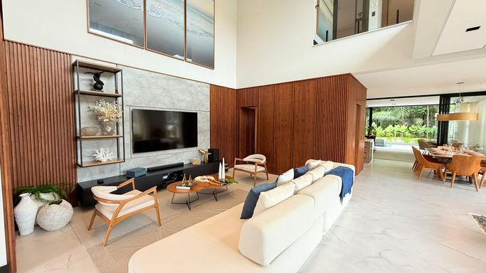 Alguns detalhes do imóvel: ✓ Finamente Mobiliada, Decorada e Equipada; ✓ Cascata; ✓ Casa inteligente: automação em toda a casa, e jardins, com controle de Alexia, som, tv e iluminação direto do seu celular ou tablet. ✓ Cozinha com ilha totalmente integrada a piscina e aos ambientes da casa. ✓ Ampla despensa; ✓ Lavabo ✓ Sala de jantar; ✓ Espaço gourmet completo (chopeira, churrasqueira a carvão, coifa e cervejeira) ✓ Mobília personalizada e de alto padrão de qualidade, móveis da casa Riviera, todos com garantia. ✓ Equipada com eletrodomésticos de ponta de excelente qualidade ✓ Suíte Master com vista para o jardim; ✓ Sauna úmida integrada com a piscina; ✓ Piscina aquecida com prainha ✓ Jardim vertical com sistema de irrigação automatizado; ✓ 05 suítes privativas, sendo uma master com hidromassagem e closet. ✓ Copa íntima no piso superior; ✓ quarto para funcionária, com WC. ✓ pisos 1.20 x1.20 da linha Portinari, assim como todo os acabamentos de azulejos e revestimentos; Com rodapé da casa toda embutido, assim o acabamento fica mais bonito. ✓ Sistema de aquecimento de água interno a gás instalado e funcionando; ✓ Sistema de gás da churrasqueira e cooktop elétrico instalado e funcionando; ✓ Vasos sanitários diferenciados, de excelente linha. ✓Portas em Laka, da melhor linha (Pormade). ✓ Louças e metais linha excelentes e de fino acabamento; ✓ Ampla sala com pé direito duplo; ✓ 4 vagas na garagem com toda infra estrutura para instalação de carregador para carro elétrico. ✓ Laje 100% impermeabilizada e com telhado; ✓ Depósito. ✓ Abrigo para cadeiras de praia; ✓ Área de Serviço e Lavanderia independentes e completas; ✓ Sistema CFTV de segurança. ACEITA PERMUTA, CARRO. Agende já sua visita!