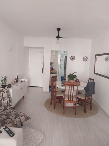 Apartamento totalmente reformado, de frente, localizado a apenas 150 metros da praia e a 500 metros do Emissário Submarino, local de eventos e campeonatos de Santos. Possui elétrica nova desde o relógio, com cabo de 50mm, cozinha planejada com coifa e cooktop, piso laminado, armários nos quartos, ventiladores em todos os cômodos e ar-condicionado em um dos quartos. A sacada já está envidraçada e o apartamento conta com gás encanado e duas entradas. Agenda já sua visita!