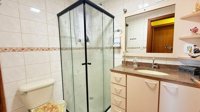 O condomínio oferece completa infraestrutura de lazer e segurança, com piscina adulto e infantil, quadra poliesportiva, playground infantil, salão de jogos, salão de festas, quadra de beach tênis, serviço de praia e portaria 24 horas.