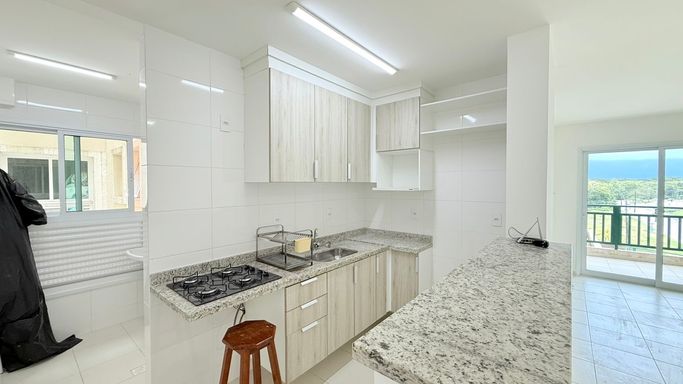 Apartamento com dois dormitórios, sendo uma suíte, totalmente quitado e com escritura. O imóvel conta com elevador, uma vaga de garagem coberta e sacada com churrasqueira.