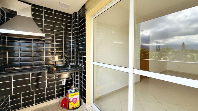Imóvel com 2 dormitórios, sendo 1 suíte, 1 banheiro social, sala para dois ambientes, cozinha americana e varanda gourmet com churrasqueira.