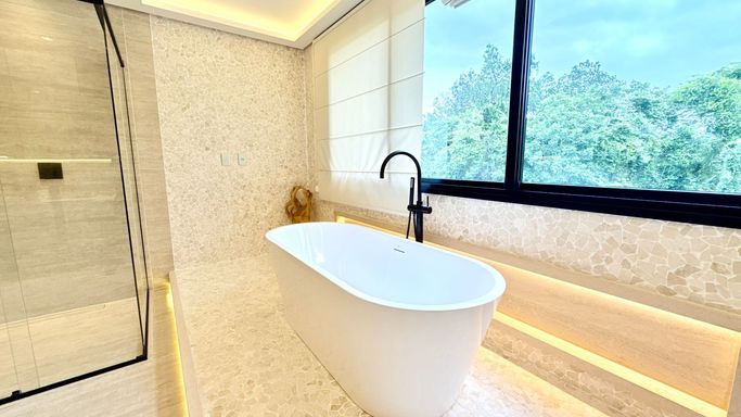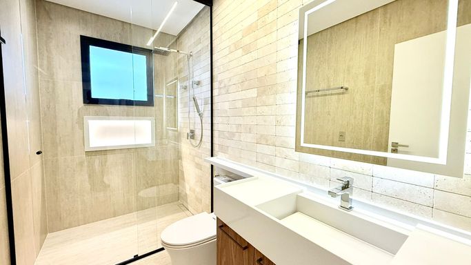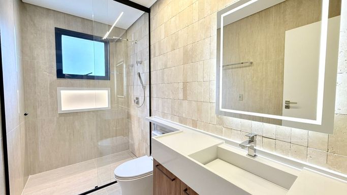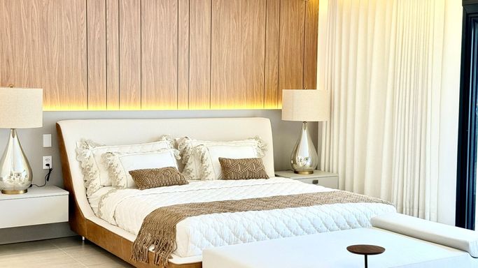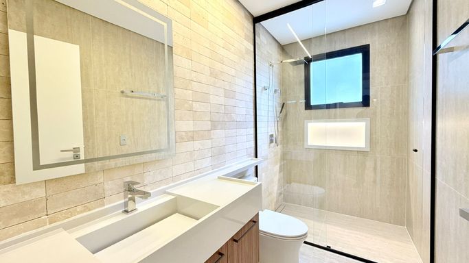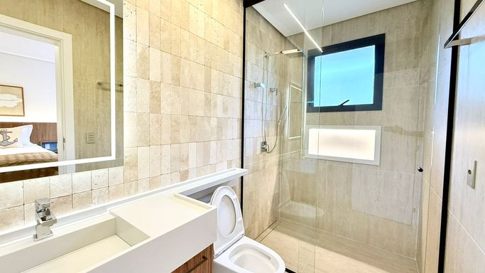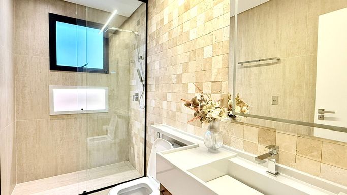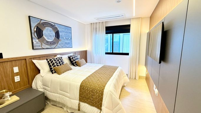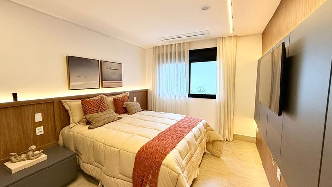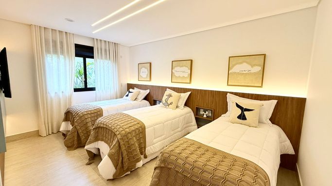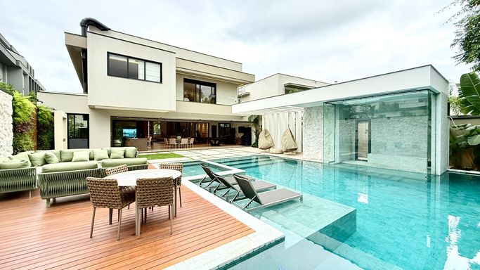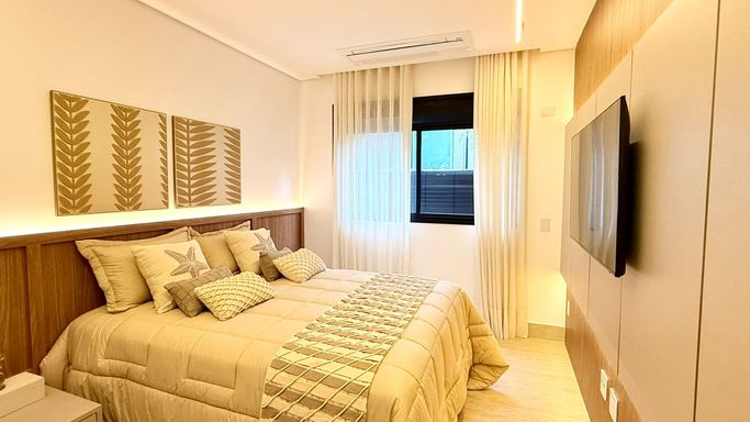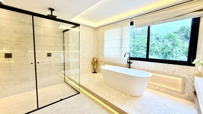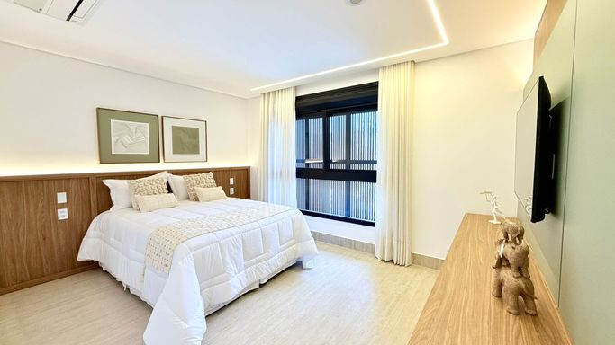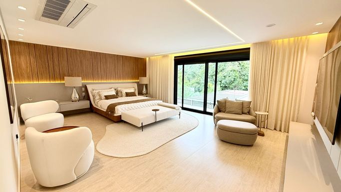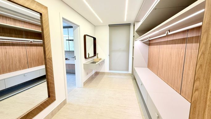 O imóvel conta com 06 suítes, além de suíte de serviço. A suíte master é um destaque à parte, com 74 m², amplo closet e banheira de imersão.