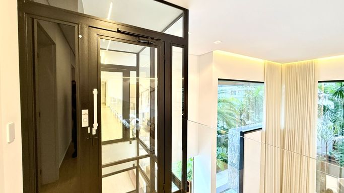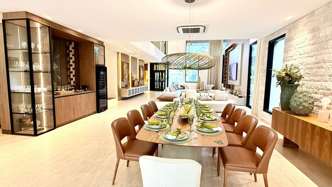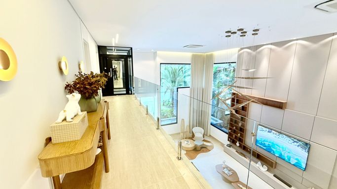A área social possui sala ampla para três ambientes com pé-direito duplo e lavabo, proporcionando elegância e integração aos espaços. A residência também dispõe de elevador privativo.