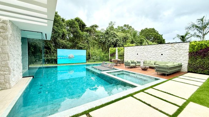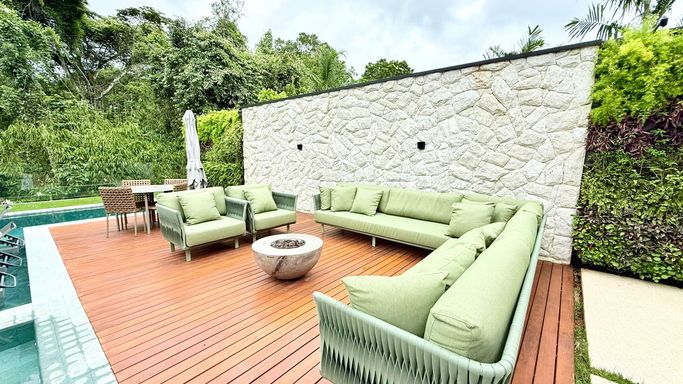 A área de lazer é completa e perfeita para momentos especiais com a família e amigos, com varanda gourmet integrada ao salão de jogos, além de uma área externa sofisticada com piscina em pedra natural Hijau, SPA, prainha, solarium, sauna e praça de fogo, criando um ambiente único e extremamente elegante.