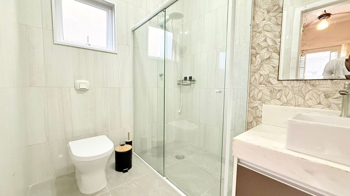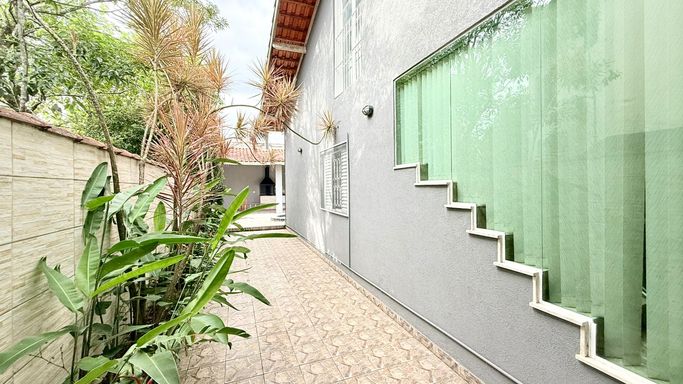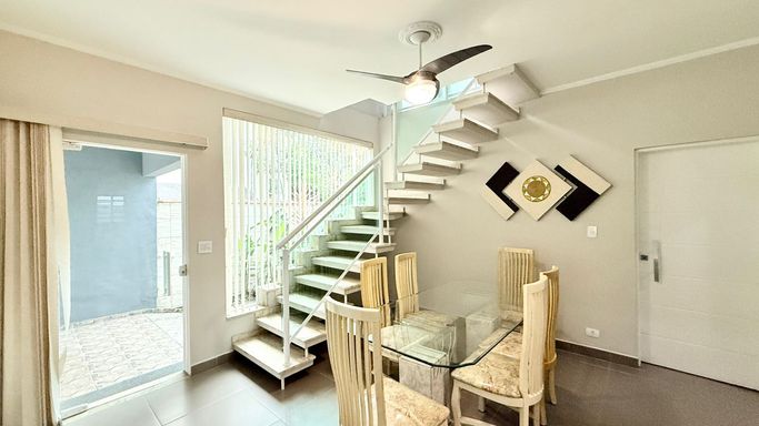 A casa também dispõe de mezanino, trazendo charme e versatilidade ao ambiente. Nos fundos, há uma edícula com quarto e banheiro, ideal para hóspedes ou apoio.