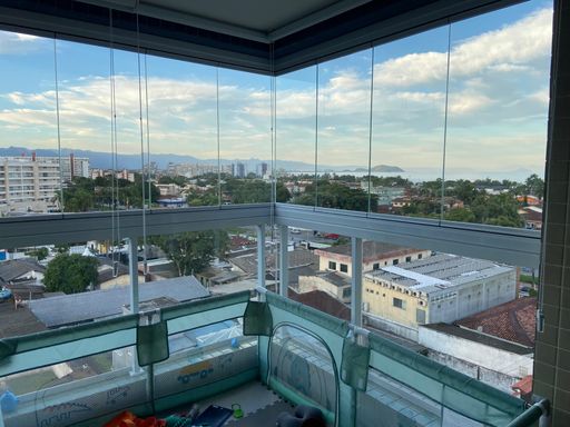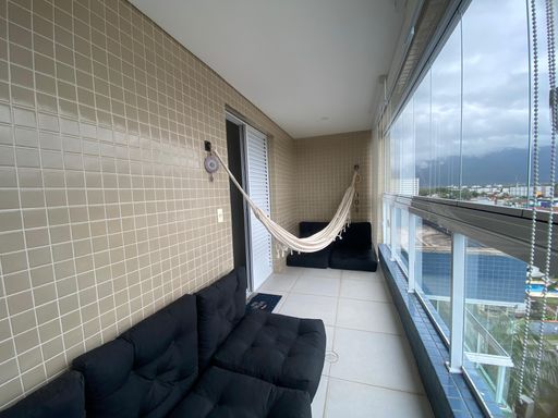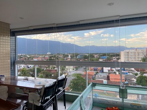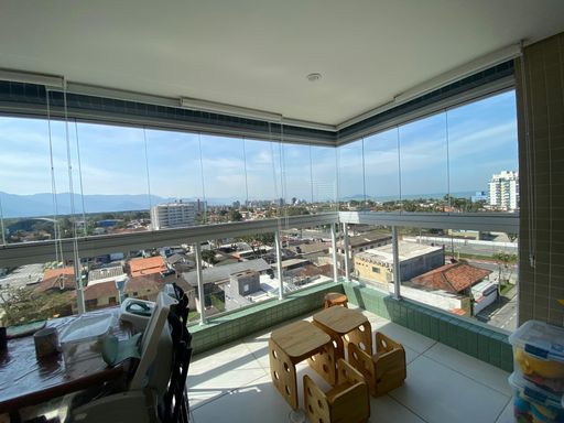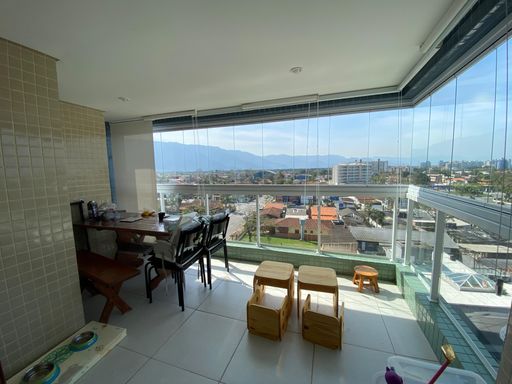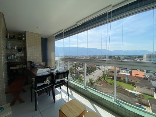 No pavimento superior, o imóvel conta com uma ampla suíte com varanda envidraçada, cortinas e vista panorâmica para o mar e a serra, além de closet planejado e móveis sob medida no dormitório.