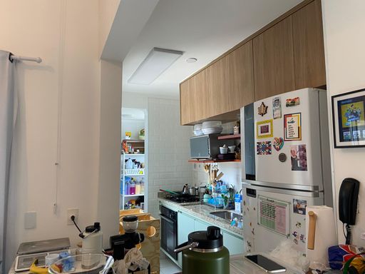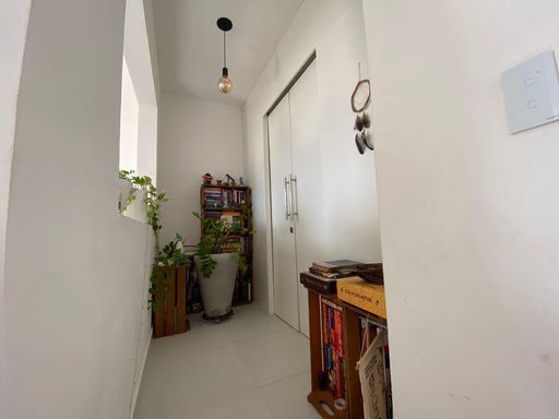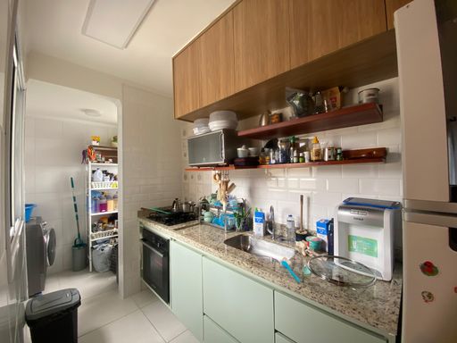 A cozinha americana conta com móveis planejados e integração com a lavanderia, garantindo praticidade no dia a dia. O quintal privativo complementa o espaço, com piscina e churrasqueira, ideal para momentos de lazer e convivência.