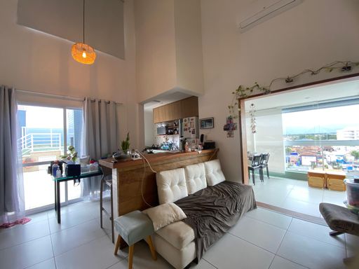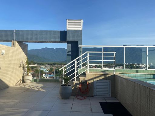 No pavimento inferior, dispõe de uma suíte com varanda, um dormitório adicional e um banheiro social. A sala de estar possui pé-direito duplo e é integrada à varanda envidraçada com cortinas, oferecendo uma vista deslumbrante para o mar e a serra.